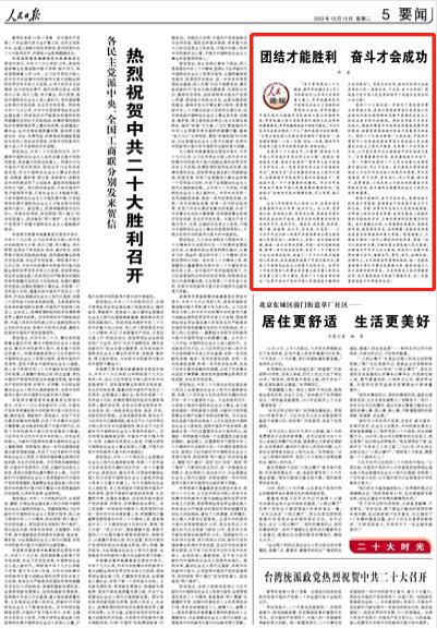 2022年10月18日第05版《人民日報》刊發仲音文章,題為《團結才能勝利 奮鬥才會成功》,全文如下: