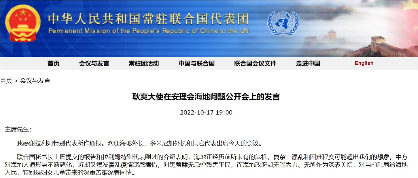 聯合國秘書長上週提交的報告和拉利姆特別代表剛才的介紹表明,海地正經歷前所未有的危機,複雜、混亂和困難程度可能超出我們的想象。中方對海地人道形勢不斷惡化,近期又爆發霍亂疫情深感痛惜,對黑幫肆無忌憚殘害平民,而海地政府卻無能為力、無所作為深表關切,對當前亂局給海地人民,特別是婦女兒童帶來的深重苦難深表同情。