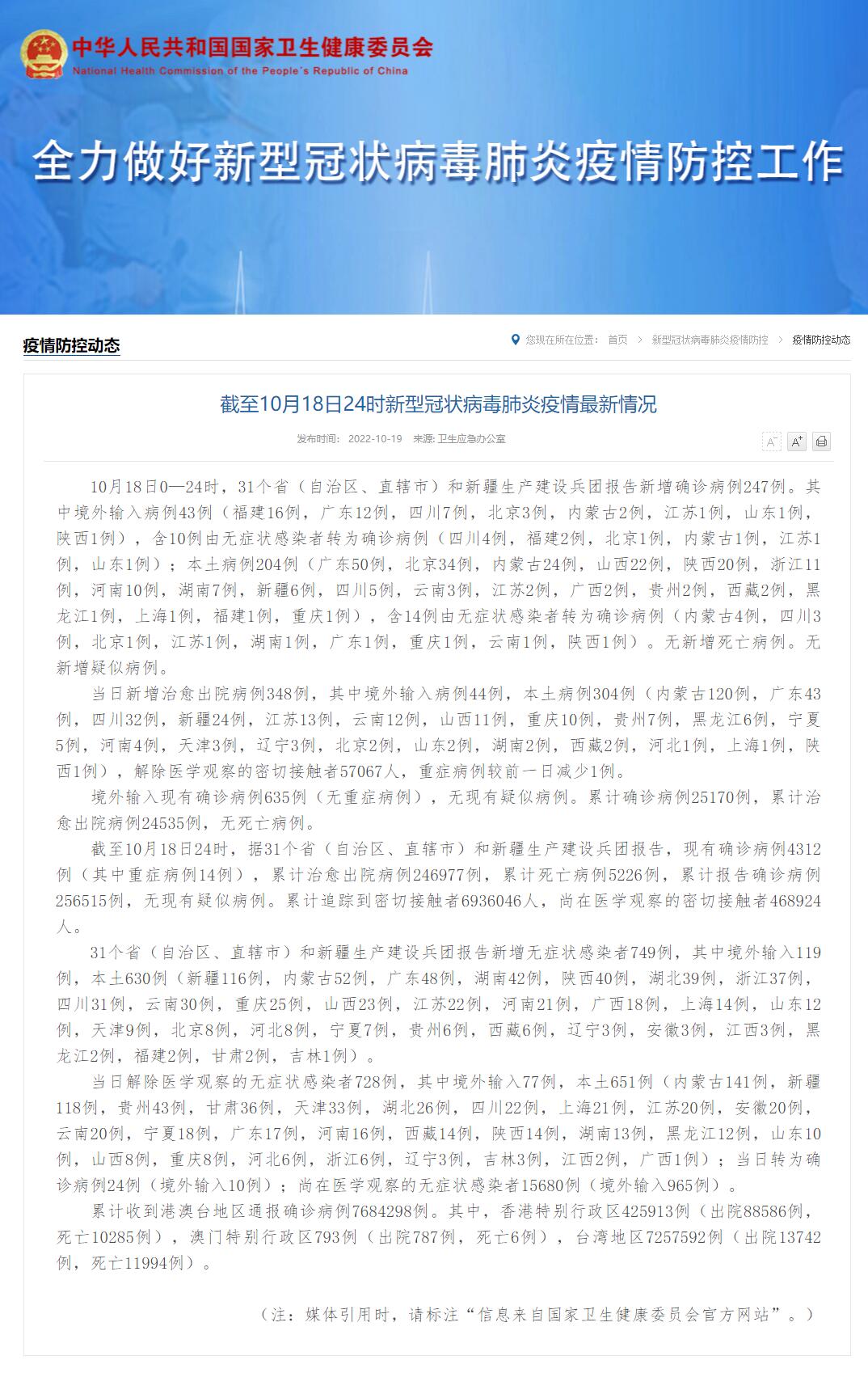 據國家衞生健康委網站10月19日通報,10月18日0—24時,31個省(自治區、直轄市)和新疆生產建設兵團報告新增確診病例247例。其中境外輸入病例43例(福建16例,廣東12例,四川7例,北京3例,內蒙古2例,江蘇1例,山東1例,陝西1例),含10例由無症狀感染者轉為確診病例(四川4例,福建2例,北京1例,內蒙古1例,江蘇1例,山東1例);本土病例204例(廣東50例,北京34例,內蒙古24例,山西22例,陝西20例,浙江11例,河南10例,湖南7例,新疆6例,四川5例,雲南3例,江蘇2例,廣西2例,貴州2例,西藏2例,黑龍江1例,上海1例,福建1例,重慶1例),含14例由無症狀感染者轉為確診病例(內蒙古4例,四川3例,北京1例,江蘇1例,湖南1例,廣東1例,重慶1例,雲南1例,陝西1例)。無新增死亡病例。無新增疑似病例。