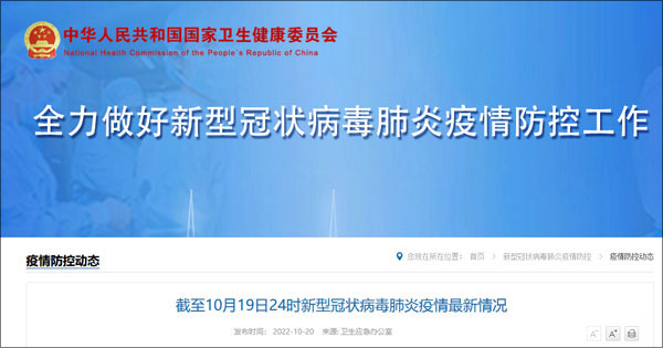 截至10月19日24時,據31個省(自治區、直轄市)和新疆生產建設兵團報告,現有確診病例4218例(其中重症病例13例),累計治癒出院病例247282例,累計死亡病例5226例,累計報告確診病例256726例,無現有疑似病例。累計追蹤到密切接觸者6995430人,尚在醫學觀察的密切接觸者467140人。