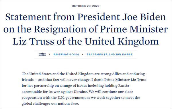 (觀察者網 訊)當地時間20日,白宮網站發佈了拜登就特拉斯辭去英國首相一事的聲明。