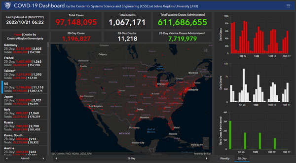 根據美國約翰斯·霍普金斯大學統計數據,截至北京時間10月21日06時22分,美國新冠肺炎累計感染病例達到97148095例,累計死亡病例達1067171例。在過去約24小時內,美國新增感染病例79196例,新增死亡病例715例。
