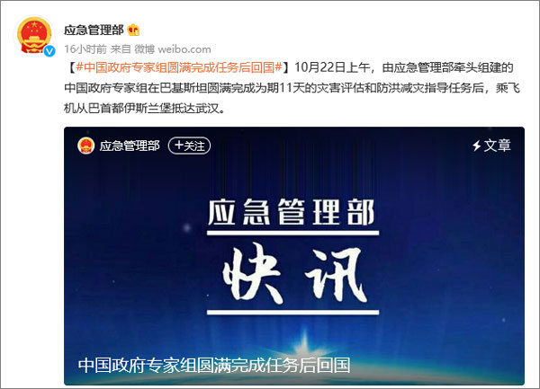 據@應急管理部 消息,10月22日上午,由應急管理部牽頭組建的中國政府專家組在巴基斯坦圓滿完成為期11天的災害評估和防洪減災指導任務後,乘飛機從巴首都伊斯蘭堡抵達武漢。