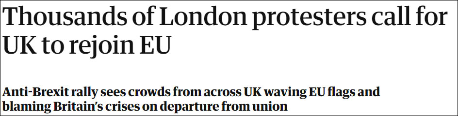 《衞報》報道截圖;成千上萬的遊行者湧上倫敦街頭,呼籲英國重返歐盟