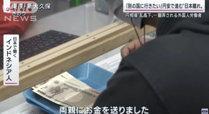 朝日電視台隨後解答了其中的原因:“他們努力工作攢下的錢,是為了寄給祖國重要的人,但是日元貶值越嚴重,在當地收到的金額就會減少得越多。有些人甚至在看到匯率後取消匯款。”許多外籍勞動者在匯款時會把用日元領取的工資換算成本國貨幣,但由於日元持續貶值難以剎車,他們的收入在換成本國貨幣時會大幅縮水。