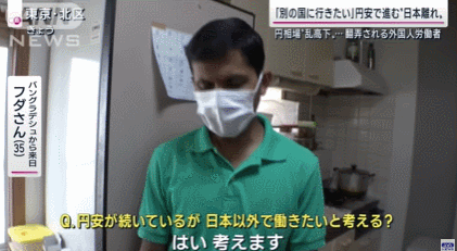 10月23日,日本朝日電視台播出一段對外籍勞動者的採訪,其中一位來自孟加拉國的男子向該台講述了日元貶值的影響,表示他的工資換算成本國貨幣的金額越來越少,令一家人的生活難以為繼,因此想要離開日本。就此,朝日電視台直言,日元貶值已導致“遠離日本”的趨勢出現。