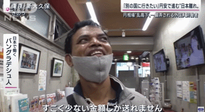 第二名受訪的孟加拉國男子也是如此,他告訴朝日電視台,他只能寄非常少的錢回家,因為相較於以前,現在的匯率暴跌,他想等日元升值後再匯款。