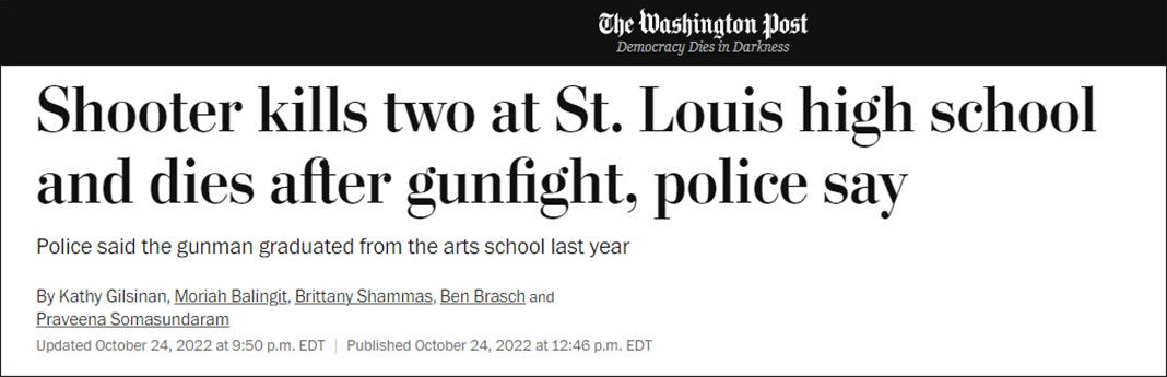 據美國有線電視新聞網(CNN)10月24日報道,這起槍擊事件發生在密蘇里州聖路易斯市的中部視覺與表演藝術高中(Central Visual and Performing Arts High School),該校位於市中心西南6英里處,擁有約400名學生。槍手是19歲的奧蘭多·哈里斯(Orlando Harris),去年從這所高中畢業,沒有犯罪前科。