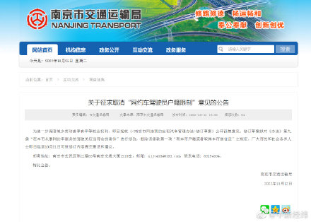 南京市交通運輸官方網站近日發佈公告就《<南京市網絡預約出租汽車管理辦法>修訂草案》公開徵集意見,擬對《辦法》第九條“在本市從事網約車服務的駕駛員應當符合的條件”進行修改,刪除該條款第一項“有本市户籍或者取得本市居住證”之規定。