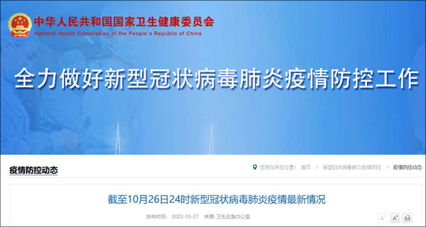 截至10月26日24時,據31個省(自治區、直轄市)和新疆生產建設兵團報告,現有確診病例3666例(其中重症病例18例),累計治癒出院病例249506例,累計死亡病例5226例,累計報告確診病例258398例,無現有疑似病例。累計追蹤到密切接觸者7426729人,尚在醫學觀察的密切接觸者481327人。