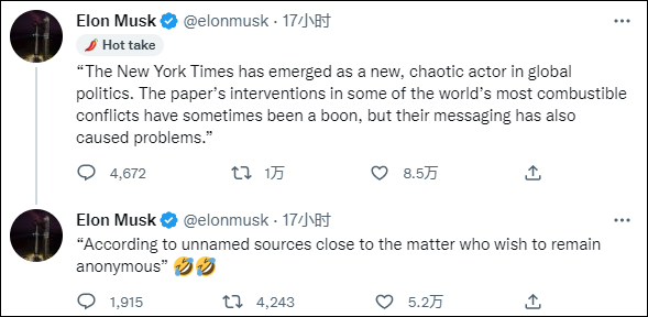 (觀察者網訊)美國《紐約時報》近期似乎對馬斯克很有意見,以至於請三人聯合撰文批評他一通。而馬斯克,選擇了“以牙還牙”。