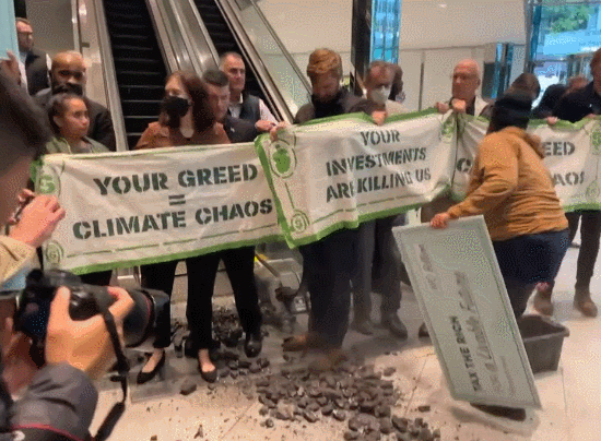 抗議大型基金公司投資化石燃料,美國環保主義者衝進公司大樓倒煤炭
