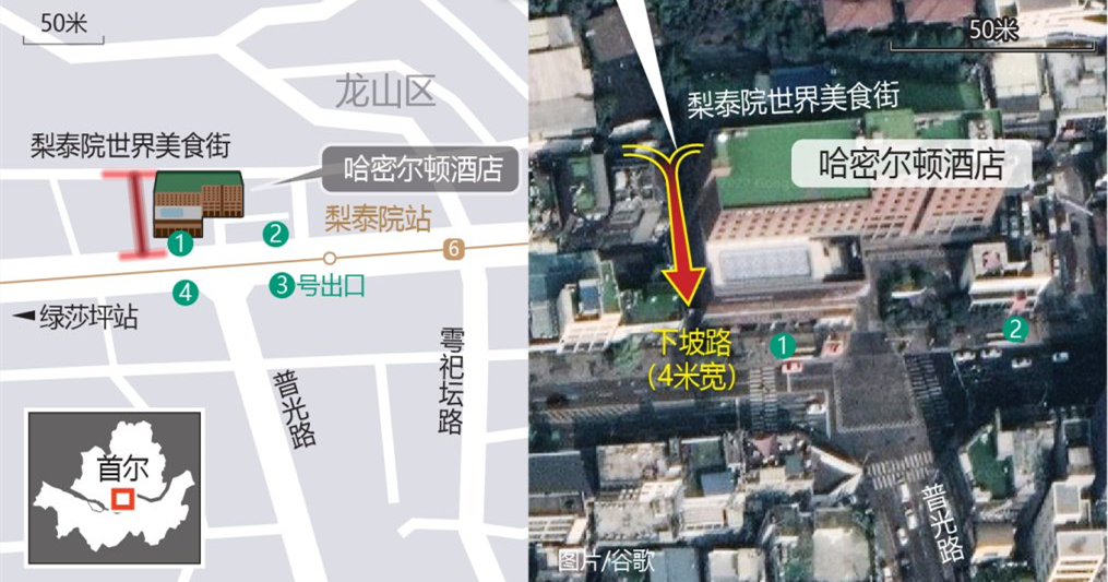 踩踏現場的窄巷,“哈密爾頓酒店”指的是漢密爾頓酒店,圖源韓聯社