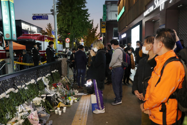 當地時間10月30日,韓國首爾民眾在梨泰院踩踏事故現場附近悼念遇難者。圖自澎湃影像