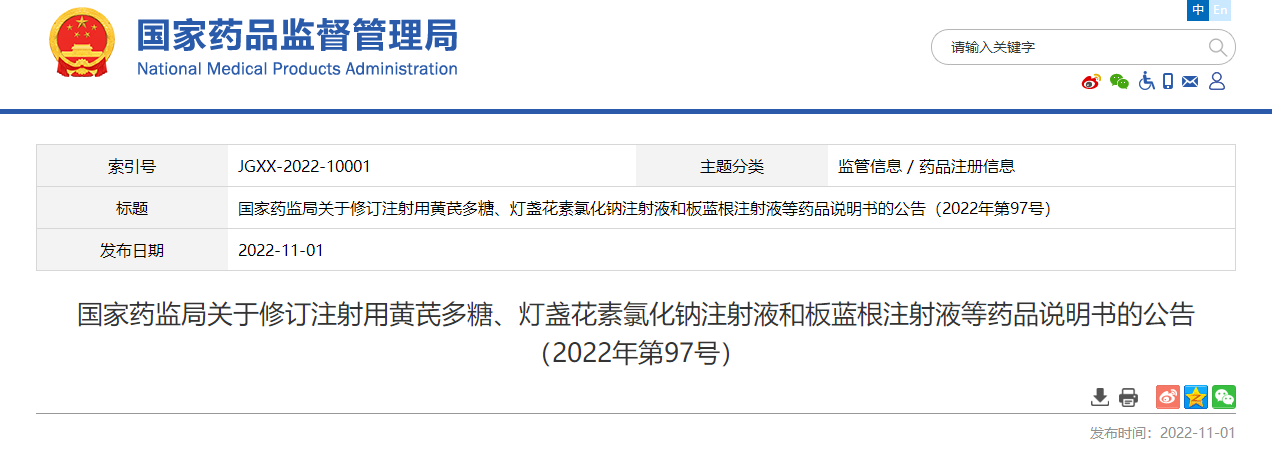 國家藥監局網站11月1日發佈《國家藥監局關於修訂注射用黃芪多糖、燈盞花素氯化鈉注射液和板藍根注射液等藥品説明書的公告(2022年第97號)》: