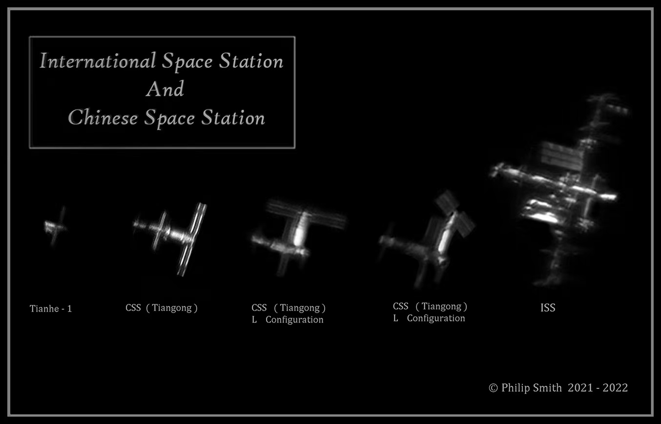 國外天文愛好者拍攝的中國空間站演變及和國際空間站對照照片(圖源:Philip Smith)