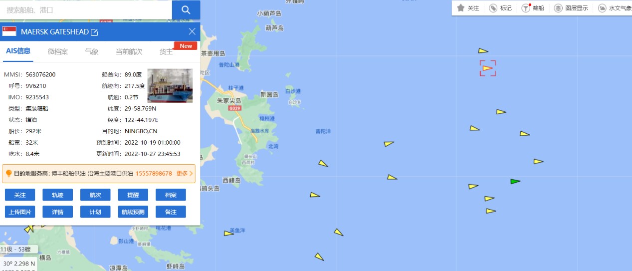 寧波港外錨地等待靠泊的集裝箱船舶,狀態顯示為錨泊