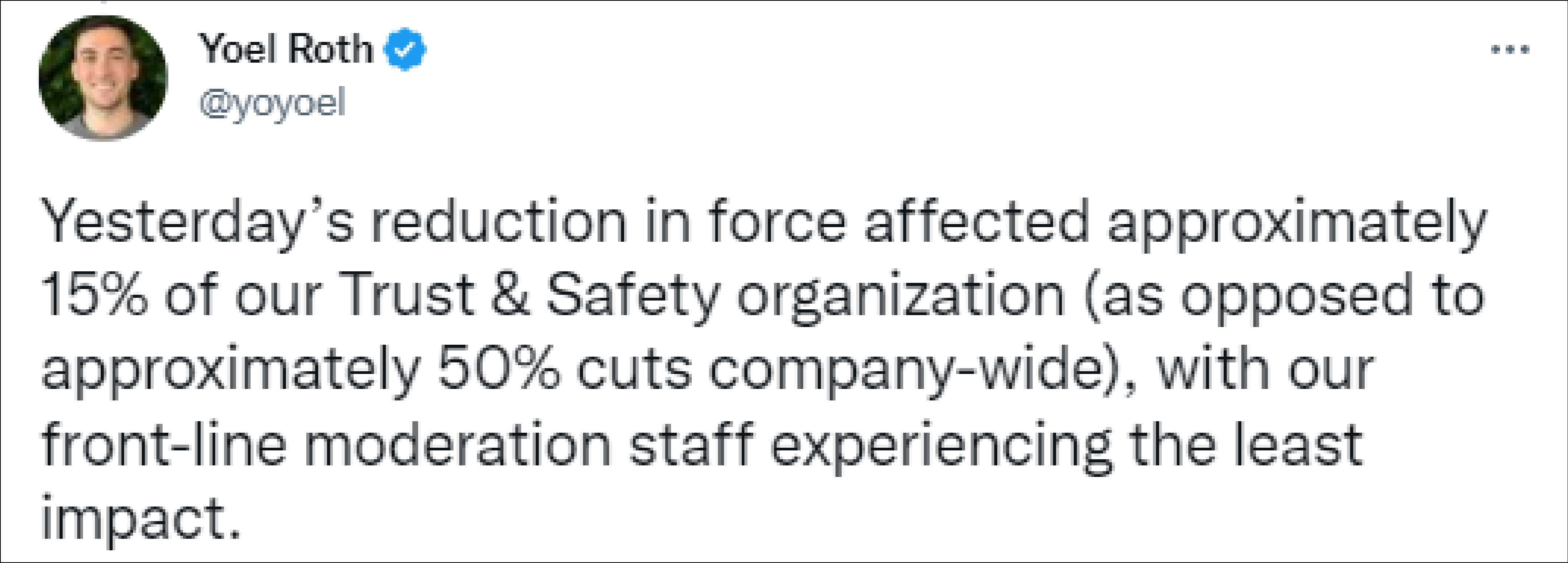 4日下午,推特安全部門負責人約爾·羅斯在推特發文稱,這場大規模的裁員影響了推特安全部門約15%的員工,相較於整個公司50%的裁員幅度,推特的一線審核人員受到的影響是最小的。
