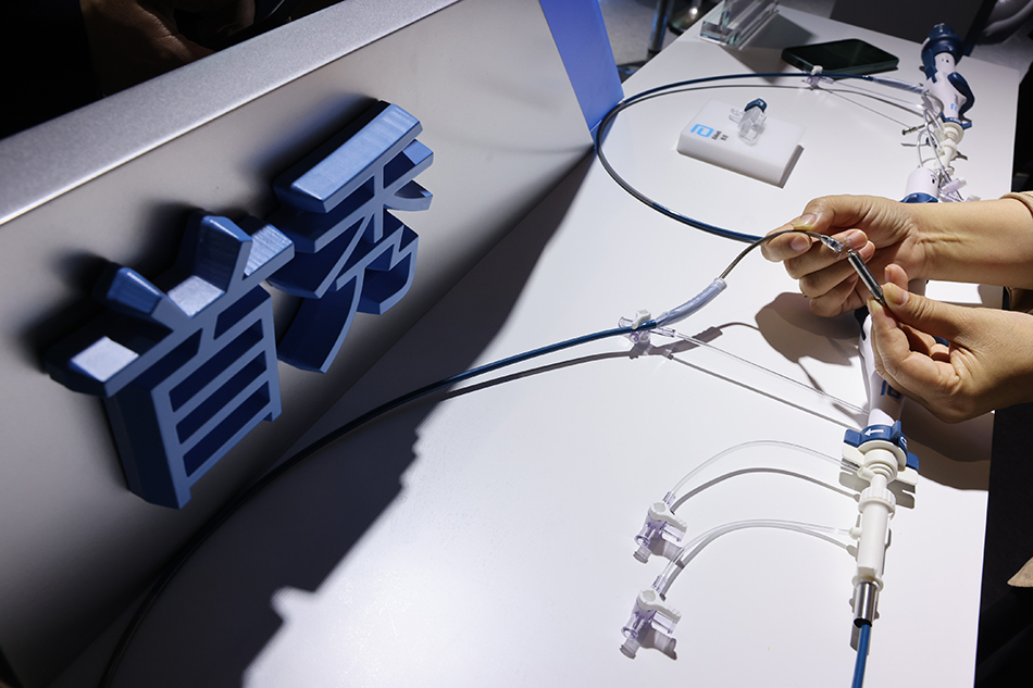 11月5日,在第五屆進博會醫療器械及醫藥保健展區,工作人員在演示一款無導線心臟起搏器。 新華社記者 金立旺 攝