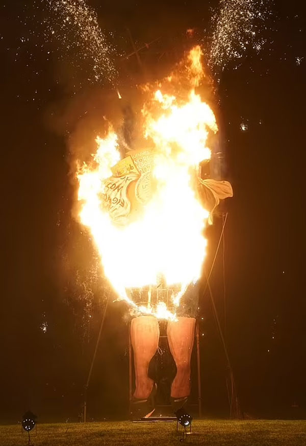據報道,5日晚的篝火節焚像儀式在肯特郡的七橡樹娛樂場舉行,特拉斯的巨像也是在這裏被點燃焚燒。