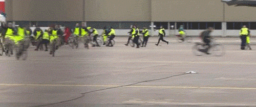 在抗議活動開始3小時後,警方來到現場,於是部分環保人士騎着自行車飛速逃跑,警察也騎着自行車追趕,在偌大的機場內,警察與環保人士展開了一場“追逐大戰”……6日,這段視頻在海外社交媒體Twitter上引發關注後,有網民給視頻加了一段非常歡樂的配樂,讓現場看起來喜感十足。警方透露,當日有200多名抗議人士被捕。