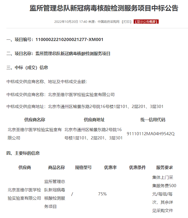 中國採購網的10月20日一份採購公告也顯示,低於3元的價格依然有企業願意投標。該公告顯示,北京市公安局監所管理總隊新冠病毒核酸檢測服務項目由北京聖維爾醫學檢驗實驗室有限公司中標。中標人在北京市醫療保障局等主管部門發佈的現行價格基礎上報統一折扣率,中標優惠率為75%。北京市現行價格基礎,為新冠病毒核酸檢測單樣本檢測15.2元/次、混合檢測2.6元/人份。折扣率只針對檢測,採樣服務費按北京市醫療保障局等主管部門聯合發佈的現行價格執行(採樣服務費0.8元/人份)。按照中標人的折扣率75%來算,中標後的混採結算價格為單人單管12.2元,多人混檢2.75元。