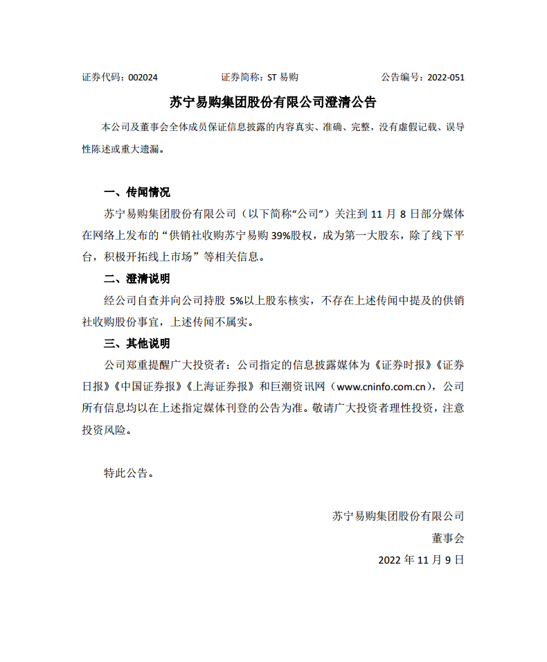 11月9日,ST易購(002024)發佈澄清公告稱,公司關注到11月8日部分媒體在網絡上發佈的“供銷社收購蘇寧易購39%股權,成為第一大股東,除了線下平台,積極開拓線上市場”等相關信息。經公司自查並向公司持股5%以上股東核實,不存在上述傳聞中提及的供銷社收購股份事宜,上述傳聞不屬實。