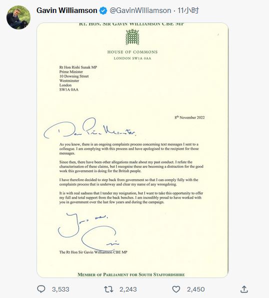 威廉姆森8日向英國首相里希·蘇納克遞交辭呈,稱他已經為發送這些短信道歉,正在配合調查。“因此,我決定退出政府,以便我能夠完全遵守正在進行的投訴程序,並洗清我的‘罪名’。”