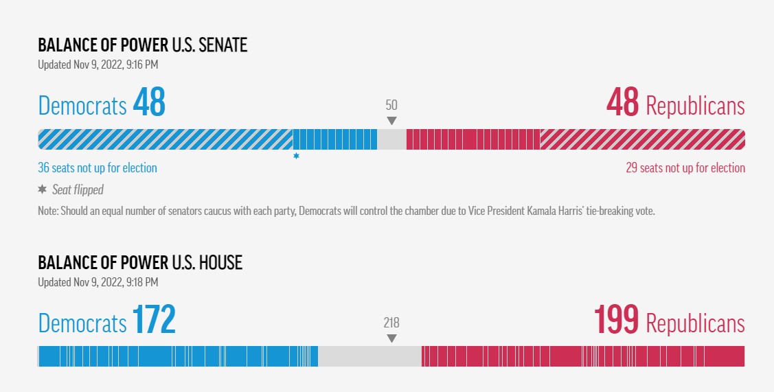 美媒普遍認為,國會的控制權仍然懸而未決。猛打“墮胎權牌”的民主黨的表現超出預期,相較之下,共和黨席捲全美的“紅色浪潮”進展並不順利。一方面,共和黨有很大可能拿下眾議院;但另一方面,賓尼法尼亞州的失利恐令共和黨難以獲得參議院多數席位。