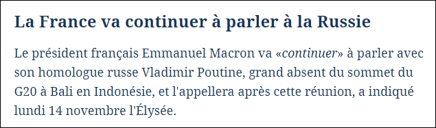 (觀察者網 訊)法國《費加羅報》當地時間14日消息,一位法國總統府官員透露,法國總統馬克龍將會“繼續”與俄羅斯總統普京溝通,並將在本次G20峯會結束後給普京打電話。