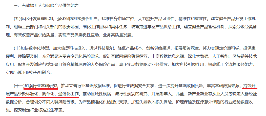 2021年,《中國銀保監會辦公廳關於進一步豐富人身保險產品供給指導意見》文件指出,要“持續開展產品條款標準化、簡單化、通俗化工作”;同年,中國保險協會也就《定期壽險示範條款(公開徵求意見稿)》等文件向社會徵求意見,旨在幫助消費者理解保險產品,同時提高監管效率。