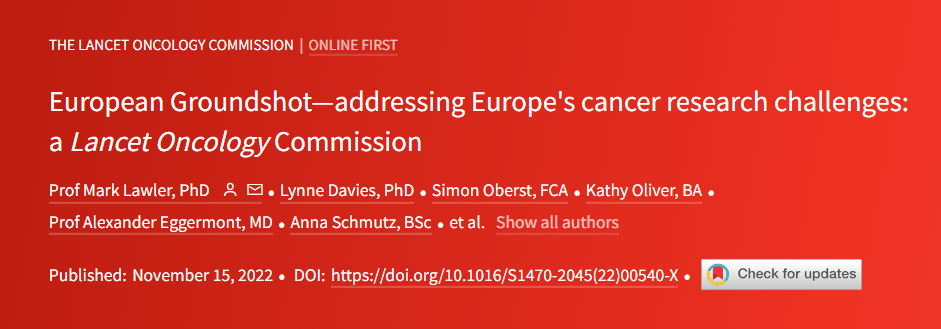 這份彙集了癌症患者、醫療專家和科學家的報告名為《柳葉刀腫瘤學委員會:歐洲射地計劃——應對歐洲癌症研究的挑戰》。
