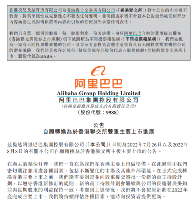 阿里在最新公告中稱,“在過去的幾個月裏,我們一直在為我們在香港主要上市做準備。在此過程中我們密切關注並考慮各種因素,包括不斷變化的市場及其他外部環境。在正式完成轉換香港主要上市之前,我們還需要制定並向股東提交審批一份新的員工持股計劃,以遵守香港新修訂的規則。新的員工持股計劃會繼續與公司的長遠發展掛鈎並與長期股東的利益保持一致。考慮到上述情況,我們將不會按原計劃在2022年底完成主要上市。我們將持續評估各種因素,適時向投資者提供更新。”