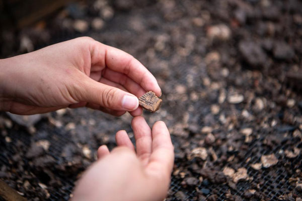 考古工作者在雲南河泊所遺址現場檢查出土的封泥(2022年9月21日攝)。新華社記者江文耀攝