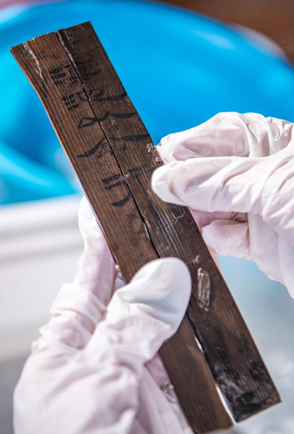 考古工作者在清理雲南河泊所遺址出土的簡牘(2022年9月21日攝)。新華社記者江文耀攝