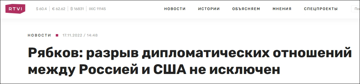 據俄語電視國際台(RTVI)17日報道,俄羅斯外交部副部長謝爾蓋·里亞布科夫(Sergey Ryabkov)接受該媒體採訪時表示,儘管這不符合俄方利益,但俄羅斯不排除與美國斷交的可能性。他還透露,應美方要求,俄美情報部門高層此前在土耳其會面,並討論了“敏感”問題。