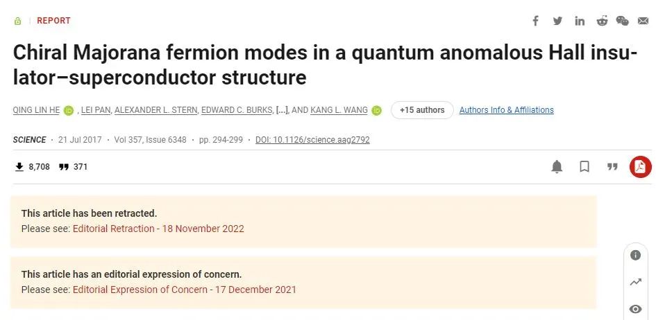 此次被撤回的論文發表於2017年7月21日。論文顯示,研究人員在實驗中觀測到了手性馬約拉納費米子 (即“天使粒子”) 。論文的通訊作者有4位,分別是何慶林、寇煦豐、張首晟、王康隆,均為華人科學家。