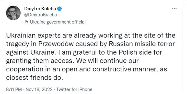 (觀察者網 訊)當地時間18日,烏克蘭外長庫列巴在推特發文稱,烏克蘭專家已經在位於波蘭的導彈墜落現場工作。
