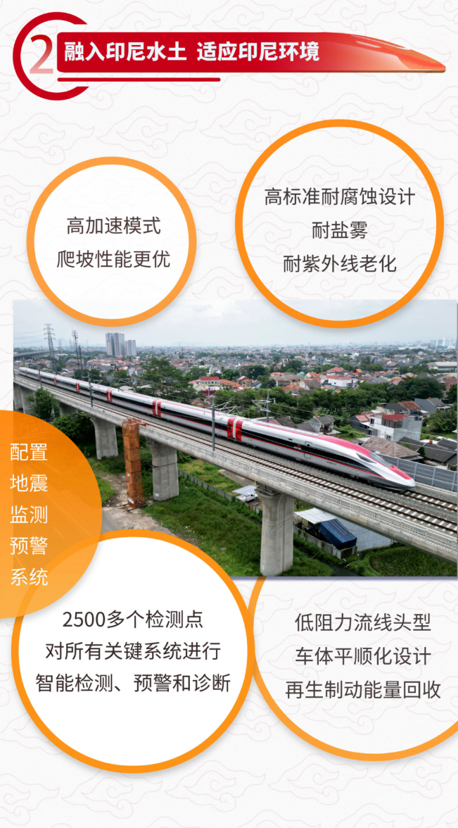 中國鐵路能走進去,做了很多本地化的工作。以雅萬高鐵為例,高鐵站的外形和裝飾是高度本地化的,車體的塗裝風格也是本地化的,車體的風阻設計及運營部分也根據環境進行了調整。