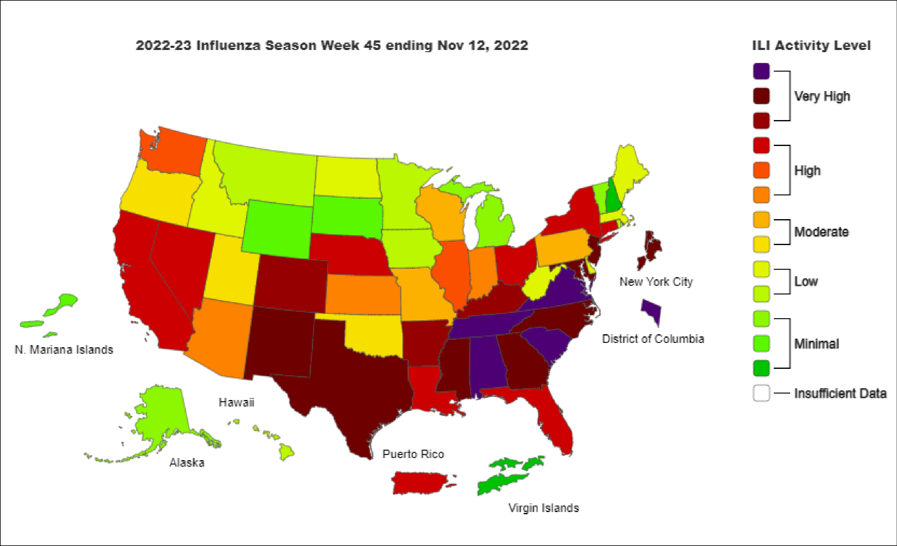 CDC網站數據顯示,2022年第45周(即11月6日至12日)全美共檢測了103830例流感樣本,其中15308例為陽性結果,陽性率為14.7%,其中15185例為甲型流感H3N2(99.2%)。自10月2日以來,全美累計已有49726例流感陽性病例。