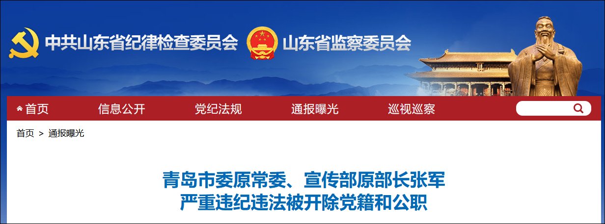 據山東省紀委監委網站11月20日消息,日前,經山東省委批准,山東省紀委監委對青島市委原常委、宣傳部原部長張軍嚴重違紀違法問題進行了立案審查調查。