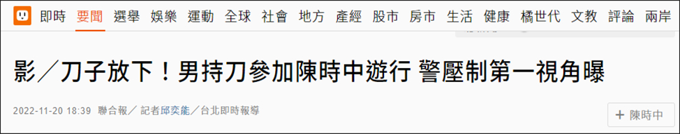 (觀察者網訊)據台灣《聯合報》、中時新聞網今日(20日)報道,台灣地區“九合一”選舉進入選前最後週日,民進黨台北市長參選人陳時中今日下午發起所謂的“疼惜台北、為愛而走”大遊行。但在活動前約1小時,突然有一名男子持刀衝上宣傳車,威脅工作人員交出麥克風,還欲自殘。在造成現場混亂後,該男子被警方使用辣椒水控制,並被帶離現場。