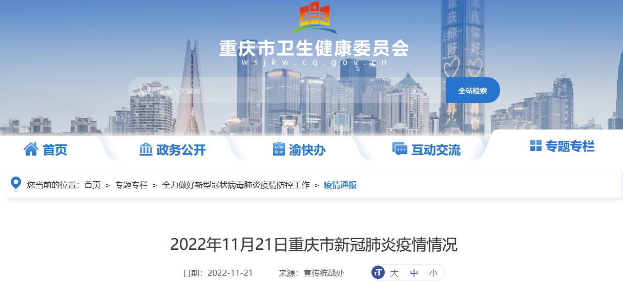截至11月20日24時,重慶市現有本土確診病例1983例(沙坪壩區240例、渝北區178例、墊江縣147例、巴南區139例、北碚區130例、南岸區120例、秀山縣101例、渝中區83例、梁平區79例、九龍坡區75例、大渡口區70例、大足區69例、涪陵區63例、開州區58例、江北區56例、合川區36例、永川區35例、萬州區34例、江津區33例、榮昌區30例、銅梁區23例、巫溪縣22例、雲陽縣20例、長壽區17例、奉節縣17例、酉陽縣15例、南川區13例、潼南區13例、彭水縣13例、綦江區12例、巫山縣11例、璧山區8例、萬盛經開區7例、武隆區6例、黔江區4例、忠縣4例、石柱縣2例),現有本土無症狀感染者34737例*(九龍坡區8004例、渝北區6534例、江北區5530例、渝中區2800例、沙坪壩區2614例、北碚區1342例、秀山縣1235例、墊江縣918例、南岸區887例、大渡口區711例、巴南區653例、梁平區489例、合川區486例、巫溪縣411例、萬州區310例、江津區257例、涪陵區215例、綦江區190例、大足區176例、雲陽縣173例、璧山區165例、開州區160例、銅梁區117例、永川區46例、潼南區43例、酉陽縣38例、南川區34例、榮昌區34例、巫山縣34例、長壽區30例、萬盛經開區22例、忠縣20例、彭水縣17例、奉節縣14例、黔江區12例、武隆區6例、石柱縣5例、城口縣3例、豐都縣2例)。