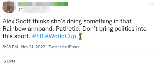 第二天,人們又看到斯科特不顧FIFA對球隊的警告在多哈的球場佩戴彩虹袖標,這引發了不少爭議。