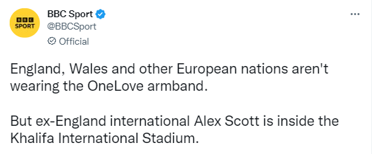“如你所見,亞歷克斯·斯科特正戴着‘ONE LOVE’袖標。索斯蓋特(英格蘭主帥)向我證實,英格蘭球員不會佩戴這個,改為佩戴FIFA的袖標。”