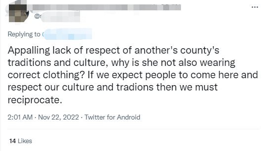 “令人震驚的是,她對別國的傳統和文化缺乏尊重。”外國網民認為,要是希望別人尊重自己的文化和傳統,就應該拿出同樣的態度對待其他國家。