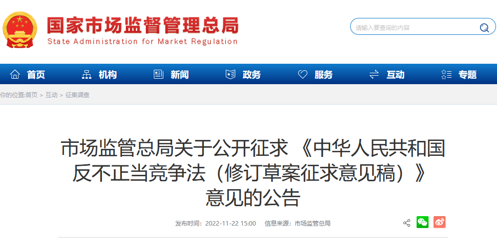 市場監管總局就《反不正當競爭法(修訂草案徵求意見稿)》公開徵求意見