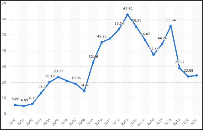 韓國對華出口順差(左軸單位為10億美元),近年呈下降趨勢(圖源:Statista)