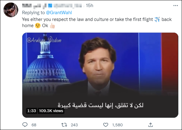 “這是他們的土地,他們的國家,他們的法律。就像他們必須尊重我們西方國家的習俗一樣,你也需要尊重他們的習俗。我同意他們的法律和意識形態嗎,當然不!但你這是赤裸裸的挑釁。你明知道你穿成這樣是進不去的。”