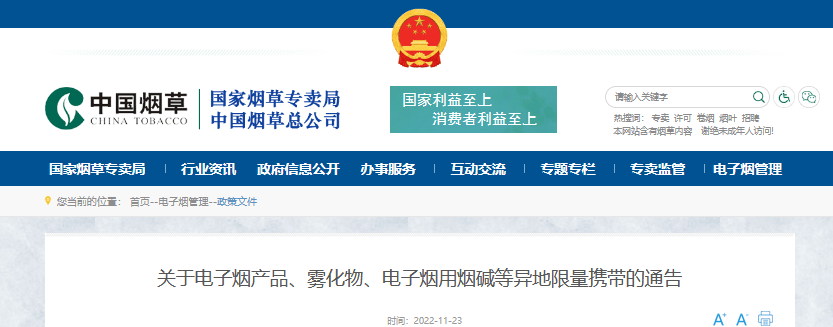 11月23日,國家煙草專賣局網站發佈通告,對於電子煙產品、霧化物、電子煙用煙鹼的異地限量攜帶、限量寄遞給予明確説明。據通告,每人每次異地攜帶電子煙煙彈數量,不得超過90個。